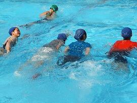最後にペットボトルを使って長く浮く練習をしました。1本のペットボトルでもお腹の上にかかえて力を抜けば長い時間浮くことができることを体験することができました。