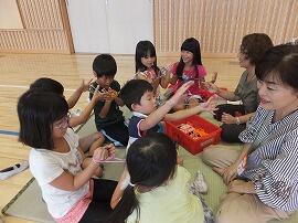 昔遊び交流会後には,給食を一緒に食べて楽しくお話をしました。