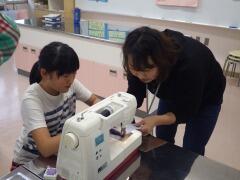 【子どもたちにミシンの使い方を丁寧に教えていただいている