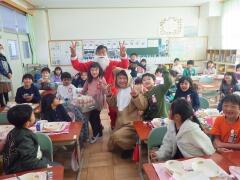 今年も、東小にサンタがやってきました。給食中に各クラスを回り、セレクトしたイチゴ・チョコレートケーキを子どもたちにプレゼントしました。