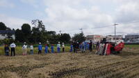 田んぼの所有者で地域協議会会長の田村様に,安全で上手な稲の刈り取り方を教えていただき,子供たちは真剣に取り組んでいました。