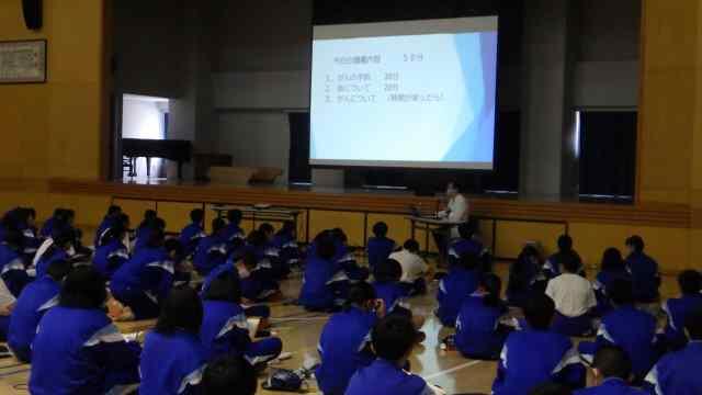 全校生徒がアリーナに集まりいつもお世話になっている薬剤師の先生から薬物乱用防止のご講和をいただきました。終了後、場所をランチルームにかえて「手洗い教室」です。石鹸で手を洗っても完璧にきれいになりにくいことを学びました。