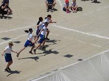 運動会リレーの練習です。トラックを使って本番同様に走ります。6年生が下級生に声を掛けて,スタートの位置や並び方,バトンの受け取り方を教えています。頼もしい6年生です。