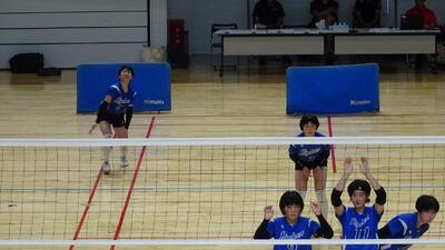 チームTシャツ「不撓不屈」、横断幕「心をひとつにつかめ栄光」の下、チームワーク・はつらつとしたプレーで試合に臨みました。第1セット、相手にセットポイントを取られるものの、諦めることなく全力プレーで24対24の同点に追いつき、その勢いで逆転で第1セットを先取しました。第2セットでは宇河総体以降、鍛え上げてきたサーブレシーブ、コンビネーションからのアタック攻撃で得点を重ね、大事な初戦を勝利しました。よく頑張りました。