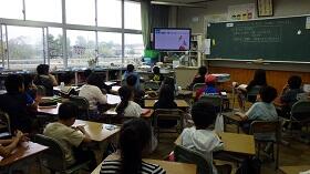 〇竜巻が通過(想定)した後、各担任が児童の安全確認を行いました。次に,机を元に戻し,学校安全係の先生から,テレビ放送を通して竜巻の特徴や被害の様子,発生したときの対処法等について話を聞きました。
