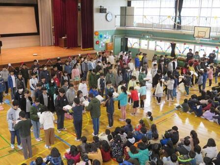 縦割り班活動や学校行事のリーダーとして活躍してくれた6年生に感謝の気持ちを伝える「ありがとう集会」が始まります。