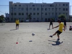 始めに選手やコーチの紹介がありました。普段身近でないプロの選手たちが目の前にいて,少し緊張気味の子どもたちでした。どんな活動をするのか楽しみ!紹介が終わるとPK合戦大会!。お手本に蹴ったプロの選手のボール,やはり速い!
