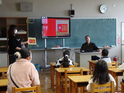 今日は,南警察署生活安全課のスクールサポーター高島さんにお越しいただき,不審者侵入時の対応の避難訓練を行いました。2年生のクラスに侵入する想定で,教職員で児童の安全を確保し,同時に不審者への対応も行う訓練でした。