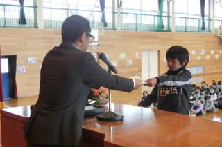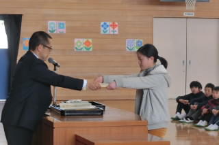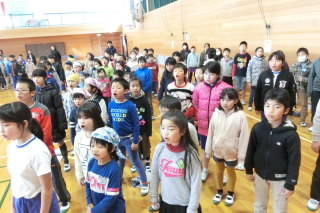 給食でお祝いのマーク入りスープを食した後,体育館で集会が行われました。