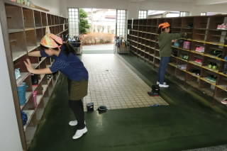 〇学校へ持ち帰ったさつまいもを2階までみんなで運び,廊下に並べて干しました。