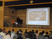 児童や保護者の質問に答える形話を進めてくれました。ピアノも弾いてくれました。