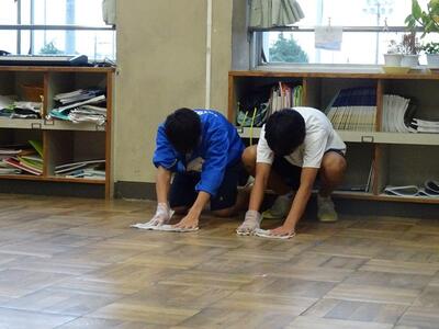 学期末を迎え、数日前から清掃の時間を5分間延長して隅々の埃をとり、本日(4日)放課後、一斉に各教室のワックスがけを行いました。美化緑化委員会が中心となり、各クラスで有志を募ってワックスがけを行い、教室は見違えるようにピカピカになりました。生徒は、手際よく意欲的に活動していたので短時間でとてもきれいになりました。協力してくれた生徒の皆さん、ありがとうございました。