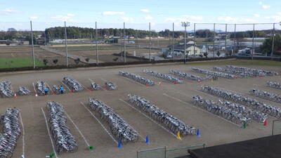 駐輪場のラインを機動班の皆さん、学校業務の高久さんが引いている最中、生徒の自転車をすべて東校庭に集めました。普段は自転車置き場が複数箇所に分かれているためあまり感じませんでしたが、こうして一同に集まるとものすごい数です。これらの自転車が登下校のほぼ同じ時間帯に地区内を走るわけですから、「自分たちくらい並進しても…」「自分だけ止まらなくても…」と考えていても、地域の人たちから見たら「あそこでも…」「ここでも…」ときっと感じるでしょう。横川中学校を良い学校にしていくためにも一人一人の自覚が大切だと強く感じました。