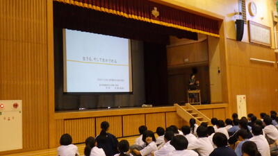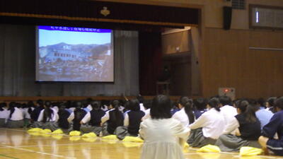 「生きる そして 生かされる」という講話タイトルのとおり,多くの中学生が「災害に備える大切さ」に加えて,「自分の命をこれからどんな風に使っていこうか」,「生かされた命を人のために使っていこう」,「苦しい時にも人と人がつながって協力し合い,前を向いて行動していくことが大切」など,学び・考えるきっかけになりました。