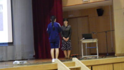 本日10月8日(水)3・4校時に,『防災に関する講話』を盛岡市立中野小学校の武藤美由紀校長先生をお迎えして,全校生徒が体育館に集合し,行いました。
