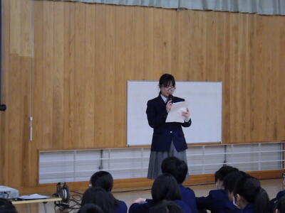 生徒指導の瀧川先生からは、冬休み明け事故報告等がなく、生徒みなさんがこうして集合できたねぎらいのほか、世の中の情報には正確ではないものが多く出回っていること近々スマホの正しい使い方についてのキャンペーンを実施する予告がありました。