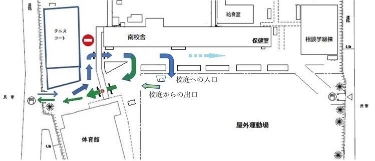 安全面や利便性から旭中の西門周辺ロータリー運用としました。また,それにともない,校庭に自家用車で入る場合には,南校舎正面玄関前を校庭への入口とします。