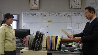 職員室で,校長が代わって賞状伝達です。