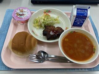 児童が大好きなココア揚げパンです。前の日から楽しみにしていて「先生,明日は揚げパンだよね。」と声をかけてくる人が何人もいました。給食を食べ始めて教室を回ると,1年生は口のまわりが真っ黒にしながらおいしそうにほおばっていました。パンに付いていたココアの粉を大切にする意味で,牛乳に溶かして飲んでいる児童もいました。これも給食SDGsの一つになるでしょう。