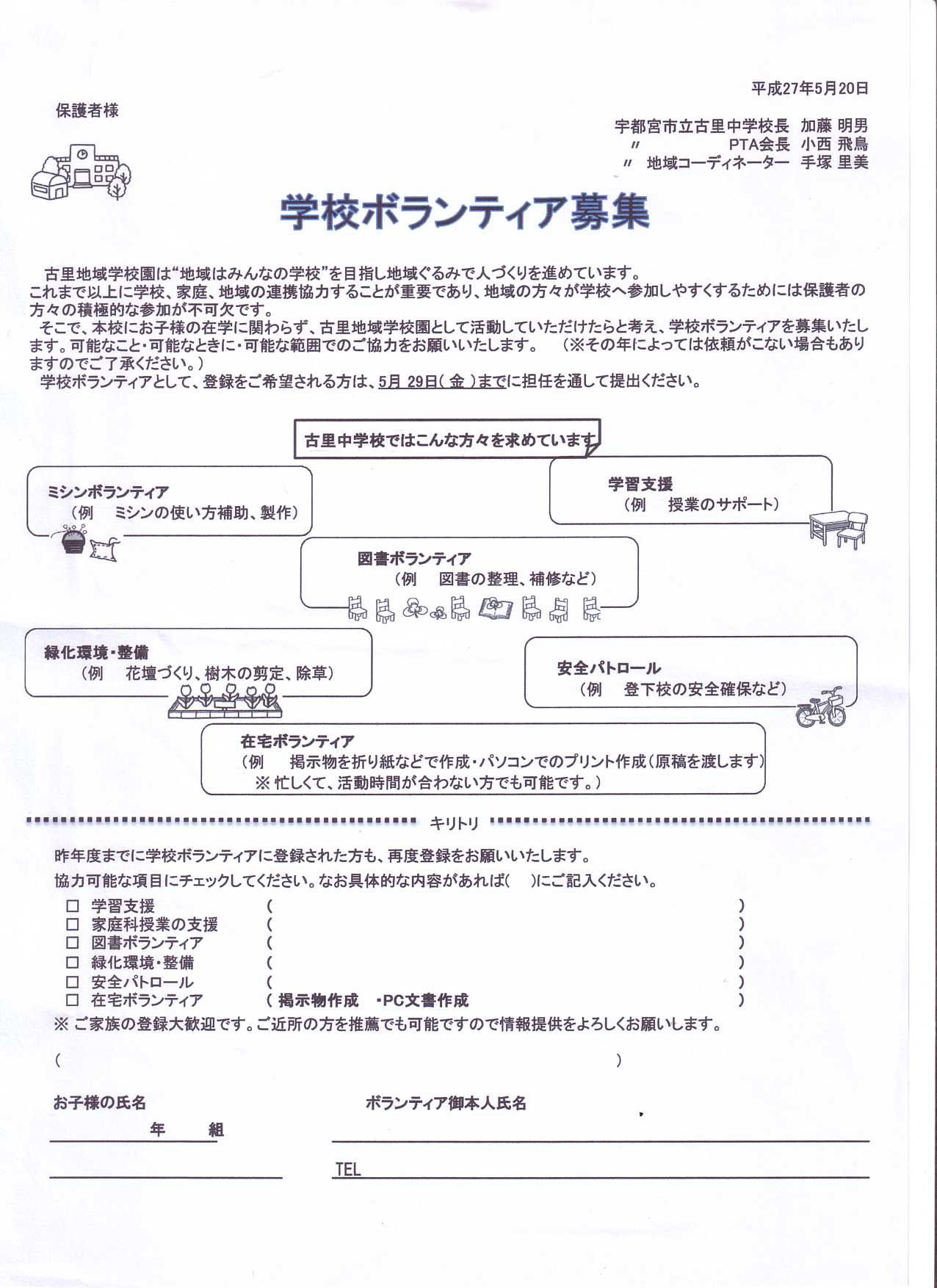 お子様の在学にかかわらず,古里地域学校園として活動していただける方を募集しています。可能なこと,可能な時に,可能な範囲でのご協力をお願いします。昨年度までに登録された方も,再度登録をお願いします。