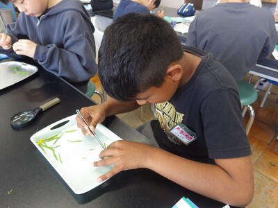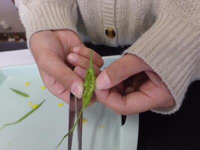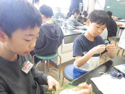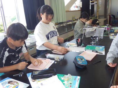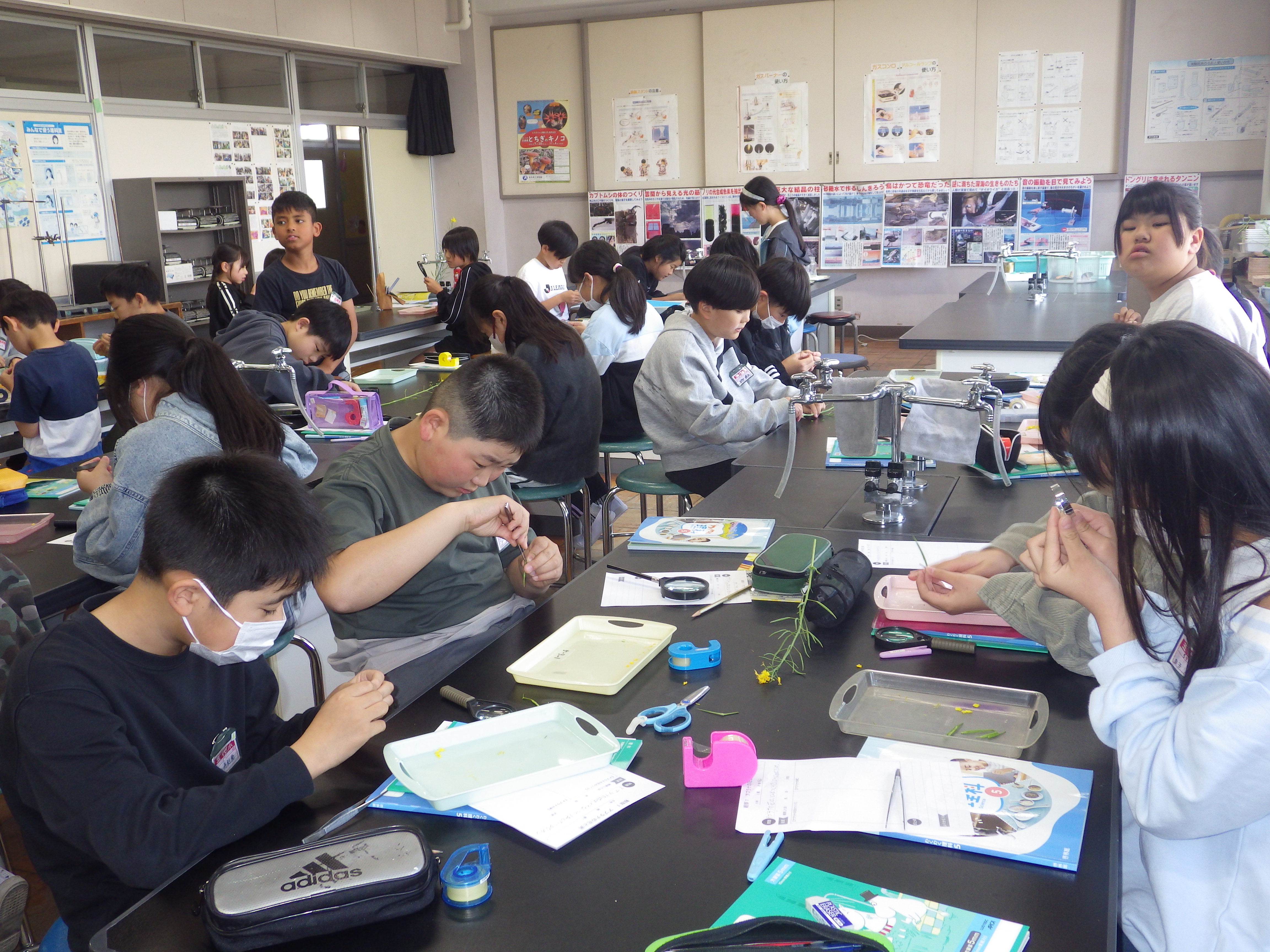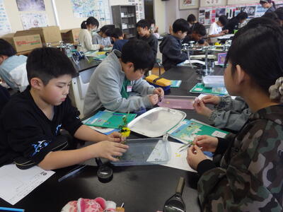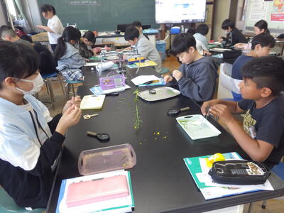 今年度も「ザ・サイエンス」を通して理科の授業の様子をお知らせします。よろしくお願いします。今日は5年の理科「花のつくり」の学習で、アブラナの花をピンセットで分解しつくりを観察してワークシートにまとめた時の様子をお知らせします。