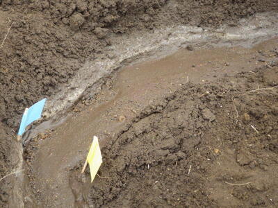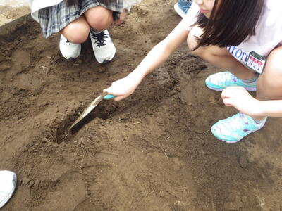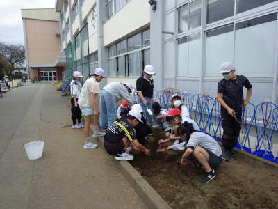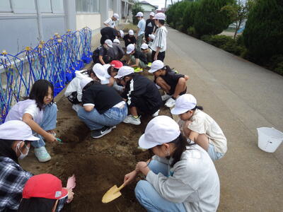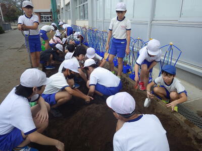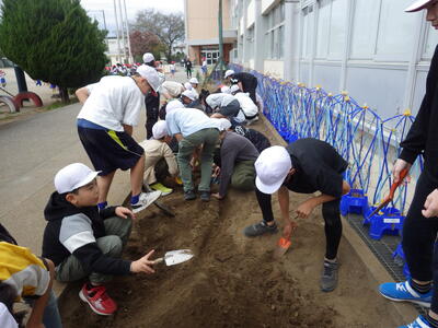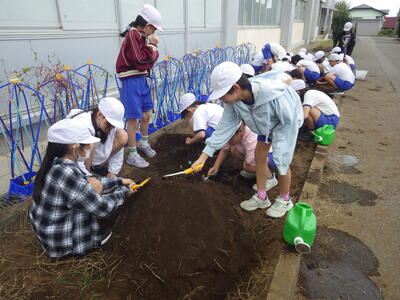 今日は、5年生の「流れる水のはたらき」の授業の様子をお知らせします。ここでは、土で山や川を作り、水を流して流れる水にはどんな働きがあるのかを調べる実験でした。本校には教科書に掲載されている実験装置がないので、花壇を実験場所として活用しました。子供たちは意欲的に取り組み、実験を通して浸食・運搬・堆積について理解することができました。