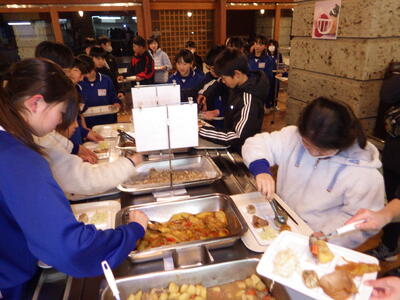1月26日(月)~30日(金)は五代小の学校給食週間です。今日から各地に昔から受け継がれている郷土料理を出します。今日は、青森県の郷土料理でせんべい汁といかメンチがでました。おいしくいただきました。