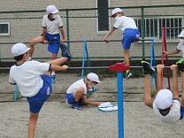 暖かな1日となりました。1年生の体育の時間,半袖・短パン姿の子供たちが増えてきました。1年生は,ボール蹴りゲームに取り組んでいます。ある学級では,小グループになって攻める側と守る側で対戦しています。中央のカラーコーンを狙っているようです。「相手をかわしてボールを転がすには・・・」と考え,相手チームとの駆け引きが見られます。途中,作戦タイムの時間に話し合っている様子も見られます。