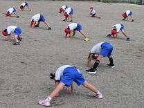と,ゴールラインに等間隔に並んでいる白チームの子供たちが教えてくれました。・・・なるほど,1年生に合わせてルールを作ってきているようですね。そう思っていると,早速,ボールが転がってきました。