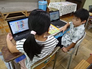 まずは体育館で,代表児童が進行してお迎えの式からスタートしました。1年生は,「1年生になったら」と「青い空に絵をかこう」という歌を振り付きで披露しましたが,最初表情が硬かった園児たちも自然と柔らかくなり笑顔も見られるようになりました。そしてその後,1年生が園児と手をつないで,グループごとに校内を案内しました。1年生にすっかり打ち解け楽しそうな園児も多く見られました。最後は,体育館に戻り,終わりの会で1年生が手作りのメダルをプレゼントしました。