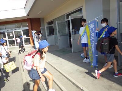 9月25日(木)さわやかな秋晴れの朝、若松原中学校の代表の生徒たちと一緒に、五代小の生活委員会の児童たちがあいさつ運動を行いました。あいさつをすると晴れやかな気持ちで、学校生活をスタートすることができますね。