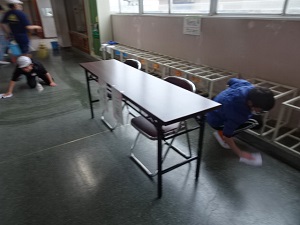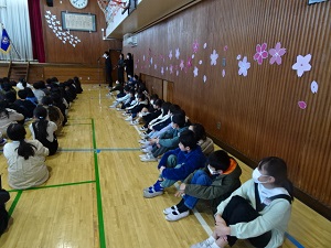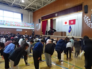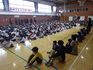 さてさて,給食の時間になりました。いつものように,味噌汁とおかずと牛乳はありましたが,ご飯はお家から持参したおにぎりです。大きいおにぎり,丸や三角のおにぎり,混ぜご飯のおにぎりなどいろいろなおにぎりが見られました。どのクラスの子供たちもいつもとは少し違うお弁当の日にワクワクドキドキといった感じで,いつもに増してたくさんの笑顔が見られました。