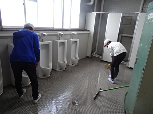 9月20日(金)学校業務機動班が来校しました。まず午前中は,1階保健室前にある棚の撤去作業です。棚は創立当時からの大きな棚で,歪みが大きく割れていたので廃棄をお願いしました。そして午後は,前回登り棒の外枠をペンキで塗り直したので,今回は登り棒のペンキを落としていただきました。