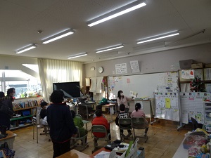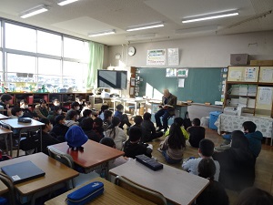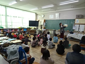 今年度の研究主題を受けて,3年生のクラスでも国語の授業を公開しました。単元名は「ワニのおじいさんのたから物」で,ねらいは物語を読み,登場人物の言動や気持ちに関わる叙述から性格を読み取ることができるです。本時の活動への興味・関心を高めるために3年生でもクイズから始まりました。2問の「性格」クイズは,本時の学習につながるものでした。その後,物語の「時・場所」「出来事」を整理し,そこから登場人物の「性格」を読み取っていく授業の流れでした。子供たちにとっては少々難しい授業だったかもしれませんが,真剣に登場人物の性格について考え,友達と意見を交換したり全体で積極的に意見を発表したりする姿が印象的でした。