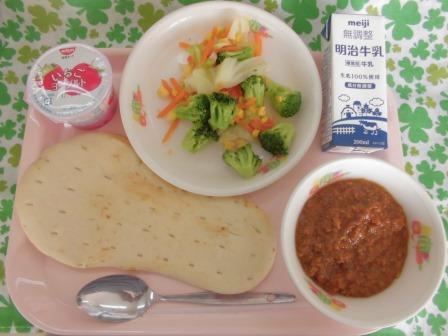 今日の献立は、ナン キーマカレー 牛乳 ゆで野菜サラダ(バンバンジー味) いちご