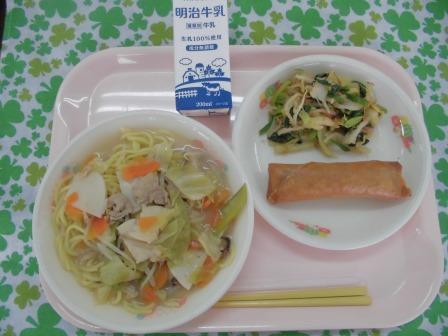 今日の献立は、ちゃんぽん麺  牛乳  春巻 ほうれん草と白菜のおひたし でした。