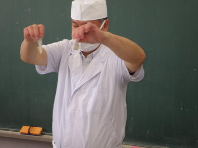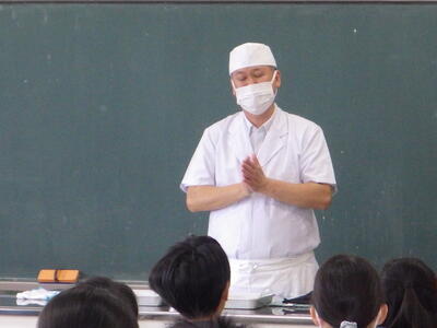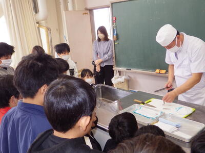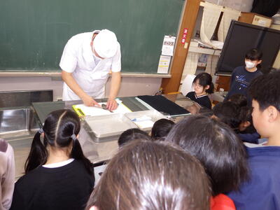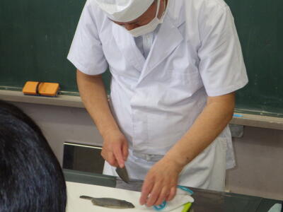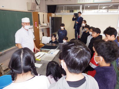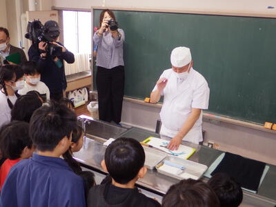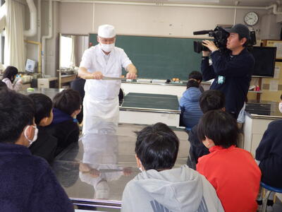 3月6日(金)家庭科室で、5年生が10月から養殖してきたヒラメを食する授業がありました。1校時から4校時まで5-2、5-4、5-1、5-3の順に授業を行いました。NPO法人日本養殖振興会の斉藤浩一さんが実際に各クラスで育てたヒラメをさばきました。事前に準備した別のヒラメの切り身を湯通ししたものを提供され、それを食するかは、児童一人一人の判断に任されました。命の大切さを感じ、感謝しながら、食べることができました。この日は、下野新聞社とちぎテレビが取材に来ました。