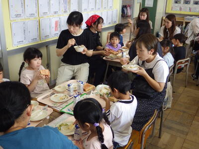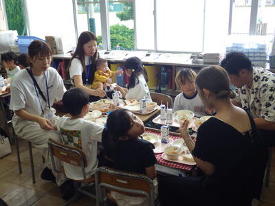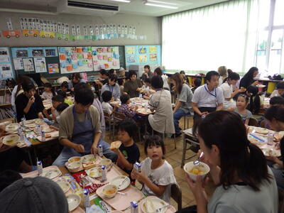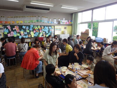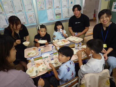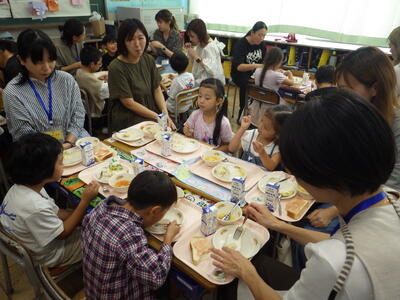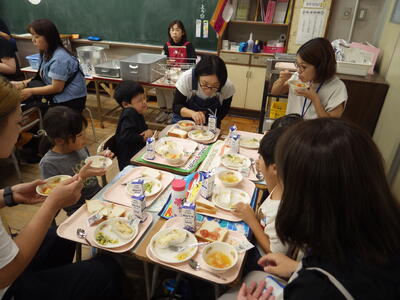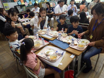 9月24日(水)11:40~13:10の給食の時間に親子給食会が開かれました。1年生の配膳の様子を見たり,