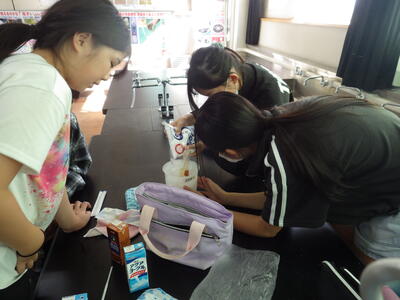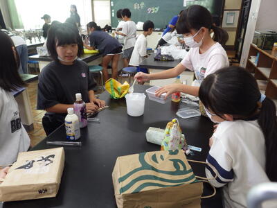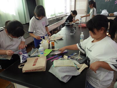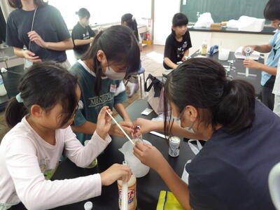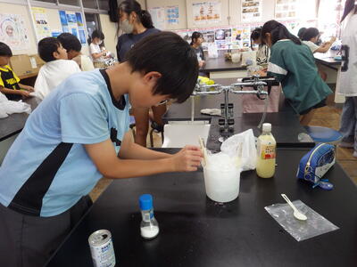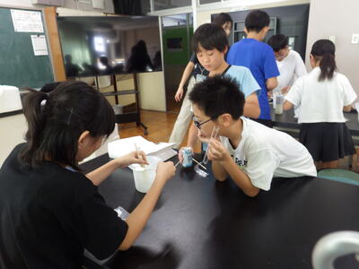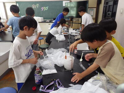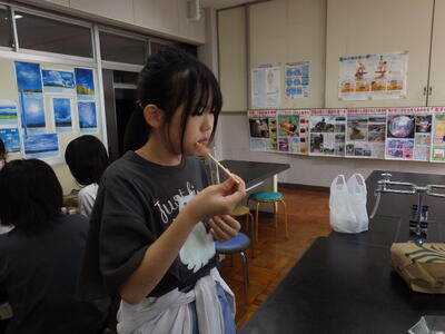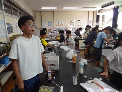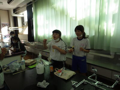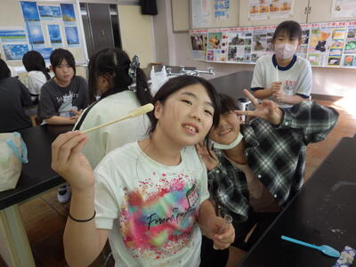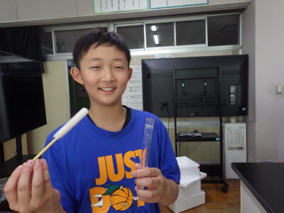 今日は9月30日(火)に行われた科学クラブの様子をお伝えします。今回は、アイスキャンディー作りに挑戦しました。新品の試験管にジュースを入れ、そこに割りばし棒を差しました。プラスチック製のビーカーに大量の氷を入れ、そこに寒剤として塩を振りかけました。ジュースの入った試験管をビーカーの中に差し込み10分ぐらい待ちました。試験管から割りばしを引くとジュースが冷え固まってアイスキャンディーができました。上手く作れた児童はおいしそうに舐めていました。お家でも簡単に作れるので、興味のある人は作ってみてください。