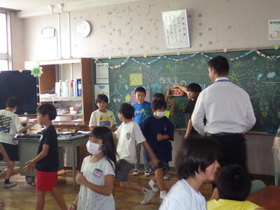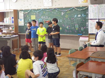 9月8日(月)~10月3日(金)の4週間、黒坂先生、西先生、久地井先生、3名の教育実習生は、教師の仕事の勉強を無事終わることができました。昼休みの放送で、全校児童にお別れの挨拶をして、5校時には各クラスで趣向を凝らしたお別れ会に参加しました。4週間、先生の卵として、子供たちと触れ合い、多くの授業を経験することができ、充実した教育実習であったと思います。五代小の子供たちも名残惜しく、3名の教育実習生に感謝の言葉を伝えていました。この経験を生かして、立派な先生になってください。