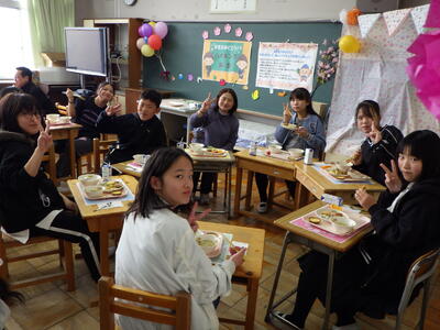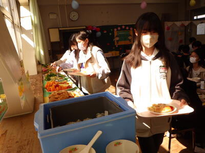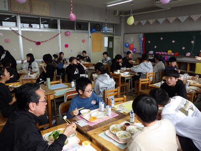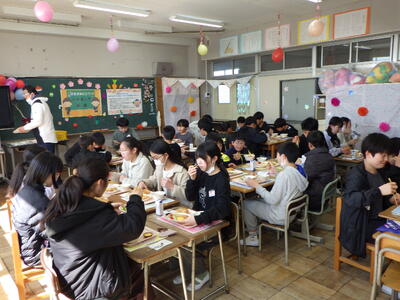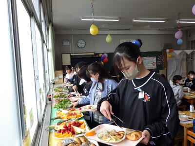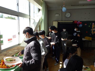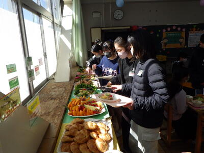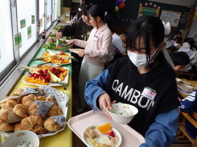3月10日(火)に2組、11日(水)に1・3組といずみ学級の卒業生が給食の時間に、バイキング方式での会食を行いました。実施することを通して、会食のマナ-を身に付けたり、人気の高いメニューを選んで、小学校での楽しい思い出を作ったりできました。メニューは、わかめご飯またはクロワッサン、鶏肉のから揚げ・肉だんご・豆乳コーンコロッケ・たこナゲット・ハートオムレツ【5種類の中から2種類まで】、卵野菜スープ・春雨サラダ(イタリアンドレッシング)・ポテトフライ、スープ・サラダ、ポテトは、自由。つぶつぶレモンゼリー・豆乳プリンタルト・ガトーショコラ・国産みかんゼリー・ポンデドーナッツいちごミルク【5種類の中から1種類】、フルーツ盛り合わせ(いちご・オレンジ・パイナップル)でした。バイキングを準備してくださった調理員さんにも感謝の気持ちをもてるといいですね。