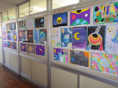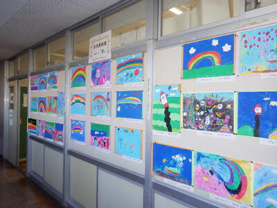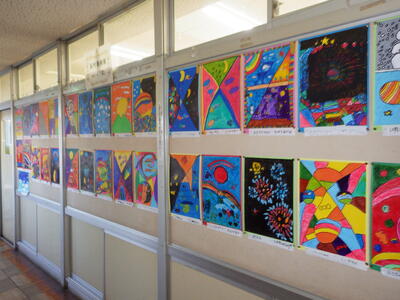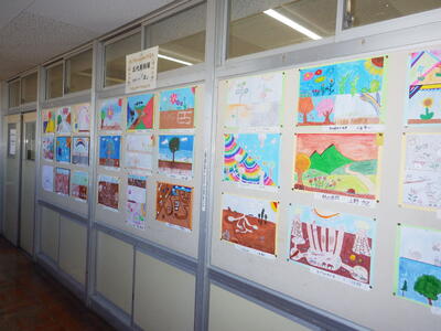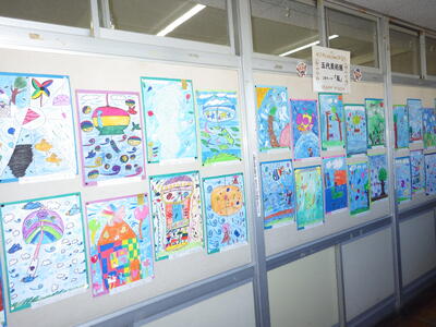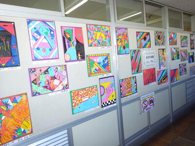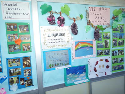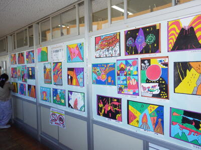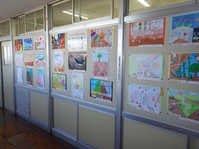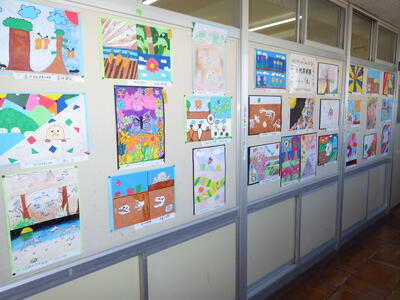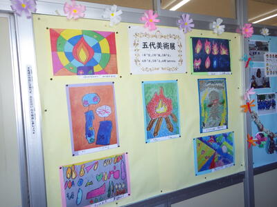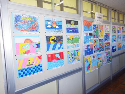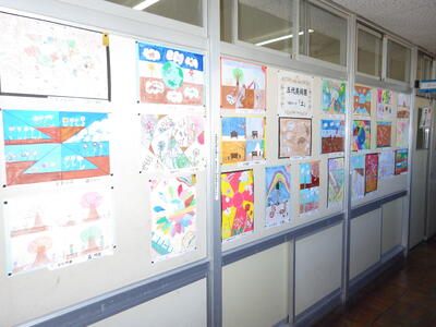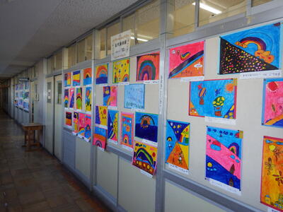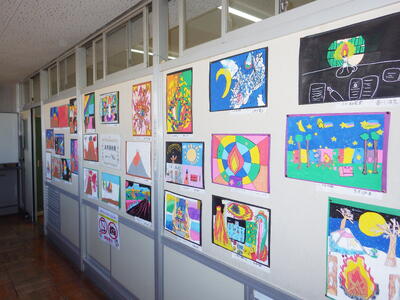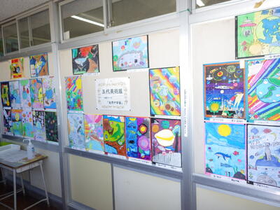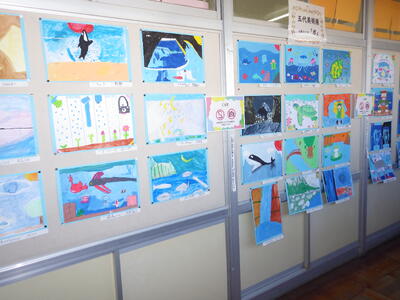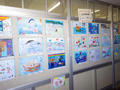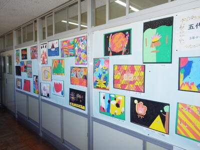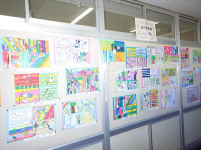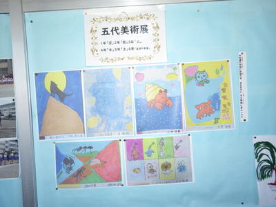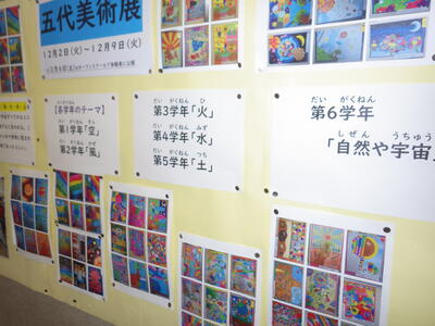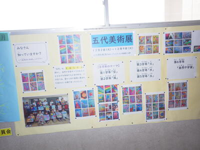 一昨年度まで続いておりました「小旗展」を改め「五代美術展」として開催して2年目を迎えます。12月2日(火)~9日(火)の期間,全教室の廊下に各学年のテーマに沿った子供たちの作品を掲示しました。6日(土)にはオープンスクールで参観者に公開することができました。各クラスとも力作ぞろいですが,17日(水)に低学年,18日(木)に中学年,19日(金)に高学年の児童の作品の中から優秀作品(特賞・金賞)を発表し,25日(木)の冬季休業前朝会(TV)で表彰式を行います。今年は,どの作品が選ばれるでしょうか