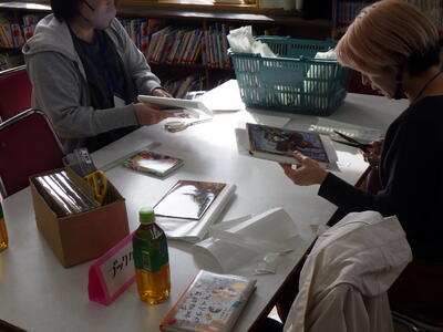 10月に入ってきた新刊のラベル貼りやカバー掛け,本の修理や清掃を行ってくださいました。カバーを貼った本や修理した本は,みなさんが借りられるように本棚に並べてあります。ぜひ,読んでくださいね。