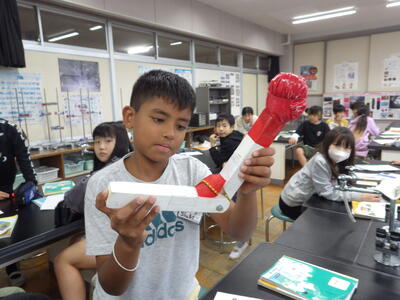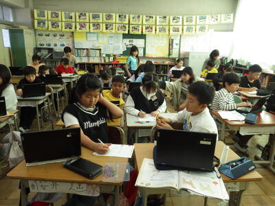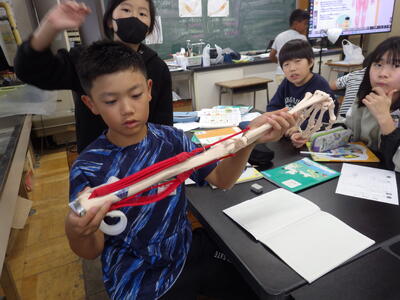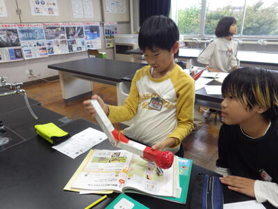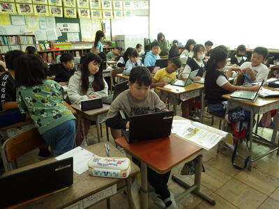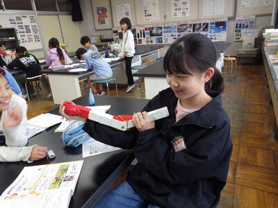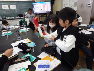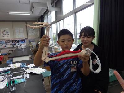 今回は4年生の理科「ヒトの体のつくりと運動」の授業の様子をお知らせします。自分の体をさわって骨や筋肉ががあることを調べた後、骨と骨のつなぎ目である関節のところで曲がるということを模型を使って確かめました。筋肉が縮んだり緩んだりして体を動かしていることを理解することができました。また、他の動物もヒトと同じしくみで体を動かしていることをパソコンを使って調べワークシートにまとめました。