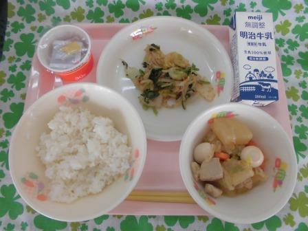 今日の献立は、麦入りごはん(自校炊飯) 牛乳 焼き鳥風和え物 いものこ汁