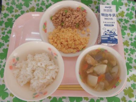 今日の献立は、麦入りごはん(自校炊飯) セルフ二色丼の具(炒り卵・鶏そぼろ)