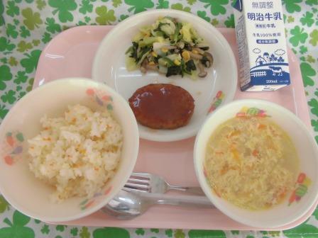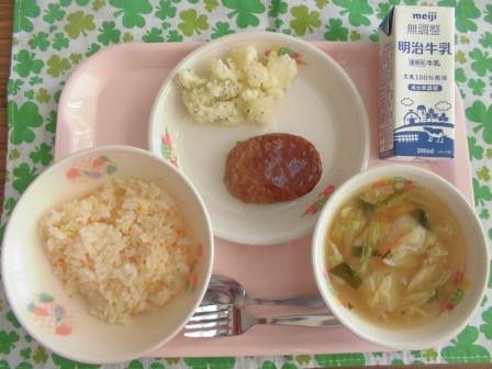 今日の献立は、にんじんピラフ(自校炊飯) 牛乳 ハンバーグトマトソース ほうれん