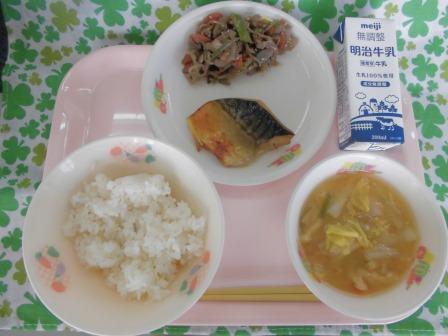 今日の献立は、麦入りごはん(自校炊飯) 牛乳 さばのカレー醤油焼き