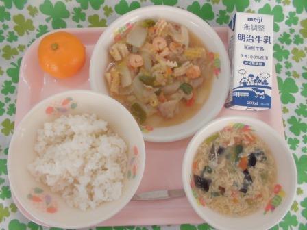 今日の献立は、麦入りごはん(自校炊飯) 中華丼の具 牛乳 青梗菜とあさりの