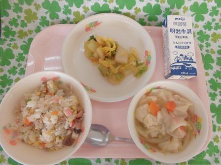 今日の献立は、チャーハン 牛乳 白菜キムチ わんたんスープ でした。